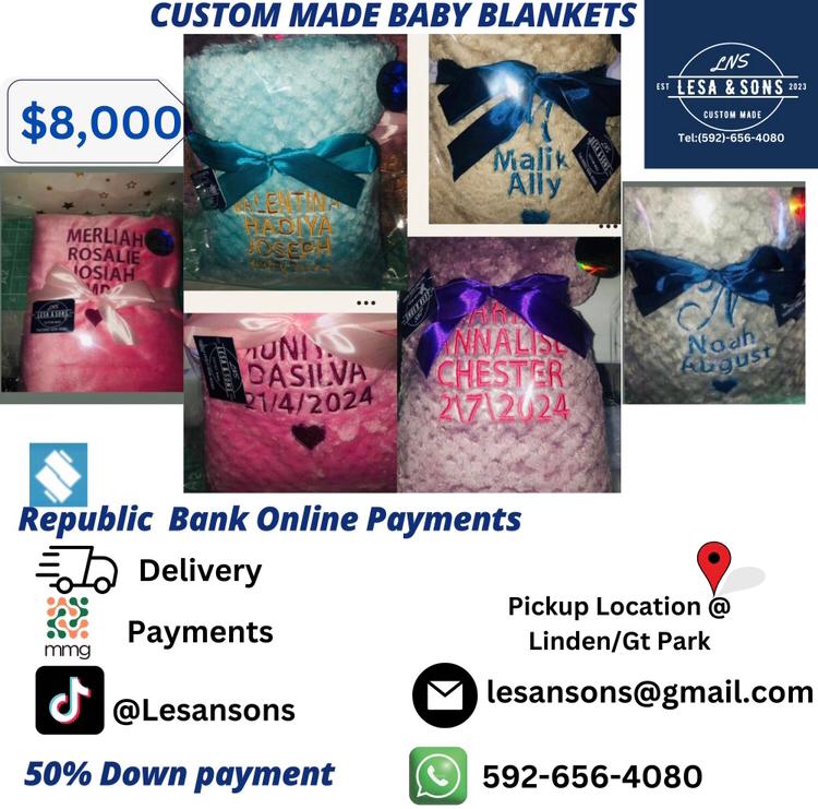 Lesa & Sons Custom Made: Embroidered baby blankets, scrubs, business shirts, polos, custom-printed tumblers, keychains, and lots more personalized items.