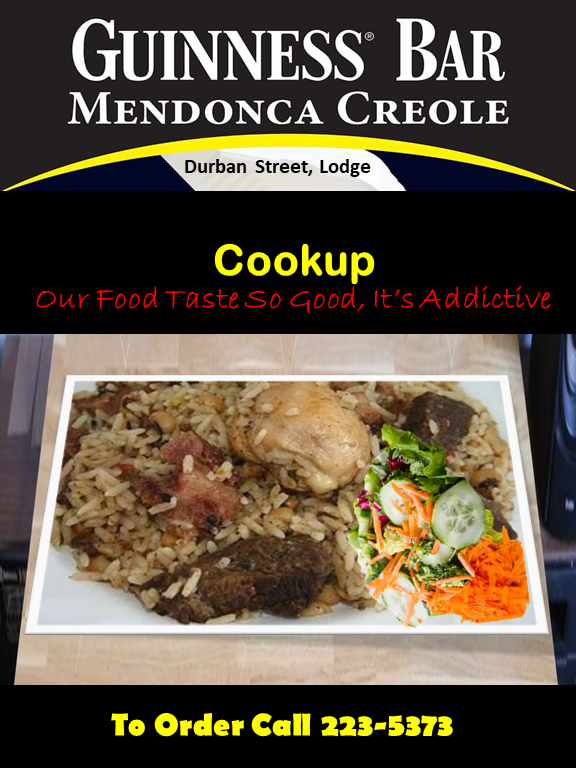 We have been in existence since 2001. At the Guinness Bar, we specialized in Creole food - we cook like home. Our food tastes so good, it's addictive. We cater to all social events. Call 223-5373 for more information.